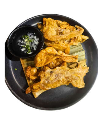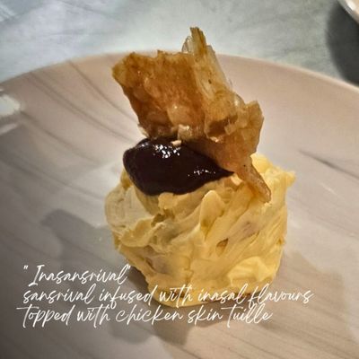 Sansrival infused with inasal flavours toped with chicken skin tuille